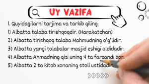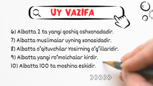 Bu bo'limda kitobda kelgan mashqlarni bajarasiz
